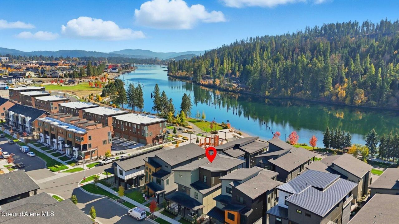Experience luxury living in this 3,708 sq ft modern home in Atlas Waterfront, located in Coeur d'Alene. This three-level residence with private elevator blends contemporary design with advanced smart home technology. A fully integrated Control4 system manages lighting, climate, audio, and security from anywhere. The open-concept main level features a striking linear marble fireplace and abundant natural light. Retractable floor-to-ceiling glass on the third level creates seamless indoor-outdoor living, complemented by covered patios and filtered river views. The chef's kitchen offers Allure quartzite countertops, Sub-Zero refrigerator and freezer, and Wolf wall oven, steam oven, and induction cooktop. The primary suite includes heated floors and a curbless walk-in shower. Complete with a three-car garage, this home delivers premier North Idaho luxury near waterfront recreation, trails, and downtown amenities.