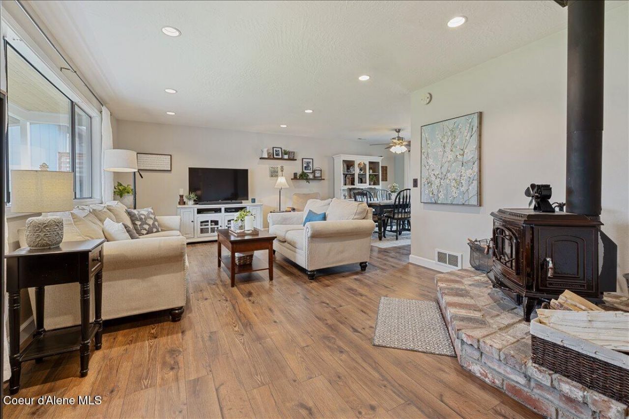 Beautifully updated multi-level home in Coeur d'Alene offering 4 bedrooms, 2.5 baths, and over 2,000 sq ft of comfortable living space on a .20-acre lot. The open-concept main level features abundant natural light and a spacious living area anchored by a cozy wood stove, perfect for North Idaho winters. The kitchen shines with stainless steel appliances, ample cabinetry, and a functional eat-up bar ideal for entertaining. Enjoy seamless indoor-outdoor living with a dining area that opens to a private deck and fully fenced backyard with sprinkler system, RV hookups, and a 12x16 storage shed. Downstairs offers a warm second living space with a gas fireplace. Additional highlights include a 2-car attached garage, a new roof, extra parking, and no HOA. Conveniently located near parks, schools, shopping, and all that CDA has to offer.